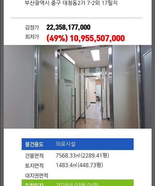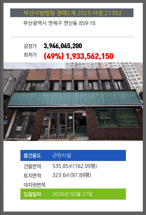 | 건물면적 | 535.85㎡ (162.09평) | 채무자 | 박** | 최저가 | (49%) 1,933,562,150 |