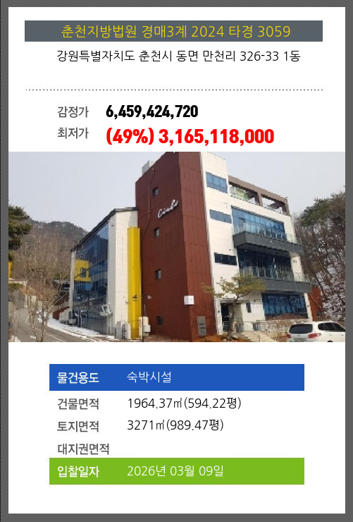 | 용도 | 숙박시설 | 채권자 | 춘** | 감정가 | 6,459,424,720 |