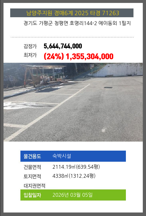 | 소재지 | [지번] 경기도 가평군 청평면 호명리144-2 에이동외 1필지 [도로명 주소] 경기도 가평군 청평면 호명리길 57-128외 1필지 |