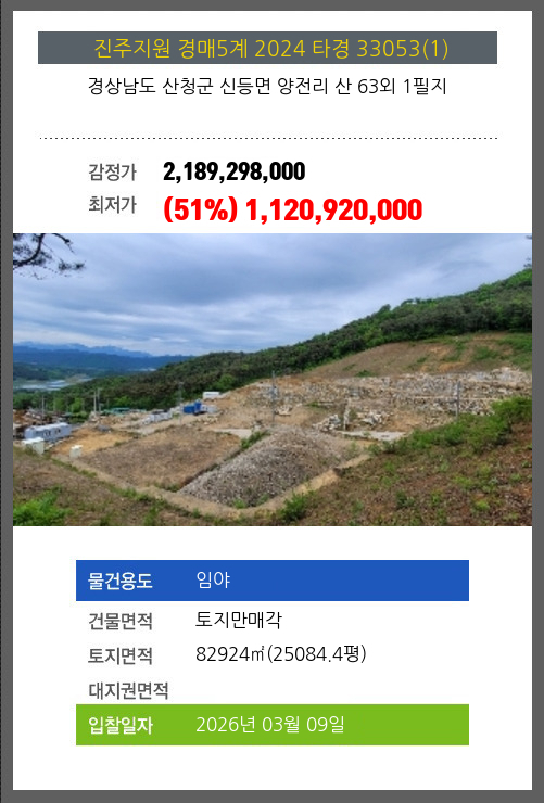 | 용도 | 임야 | 채권자 | 진** | 감정가 | 2,189,298,000 |