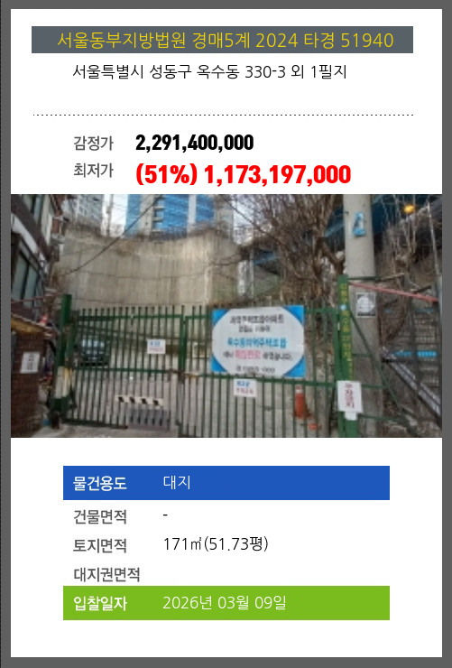 | 건물면적 | – | 채무자 | 옥** | 최저가 | (51%) 1,173,197,000 |