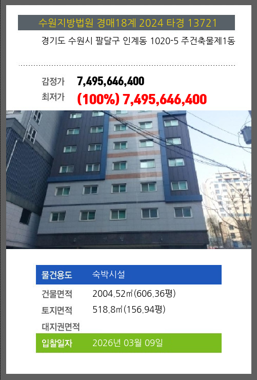 수원숙박시설경매 수원시 팔달구 인계동 1020-5 주건축물제1동 №2024 타경 13721
