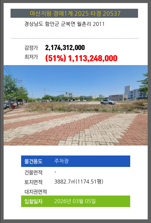 | 용도 | 주차장 | 채권자 | 농**외1명 | 감정가 | 2,174,312,000 |
