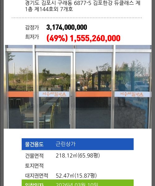 | 소재지 | [지번] 경기도 김포시 걸포동 1555 오스타파라곤아파트 제309동 제6층 제602호 [도로명 주소] 경기도 김포시 걸포1로 39 오스타파라곤아파트 제309동 제6층 제602호 |