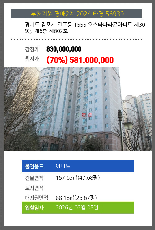 본건은 경기도 김포시 걸포동 1555 오스타파라곤아파트 제309동 제6층 제602호