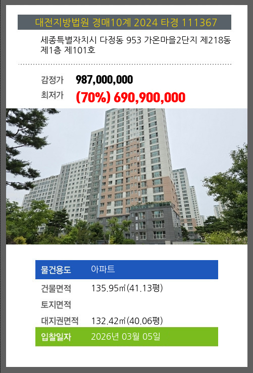 | 건물면적 | 135.95㎡ (41.13평) | 채무자 | 노** | 최저가 | (70%) 690,900,000 |
