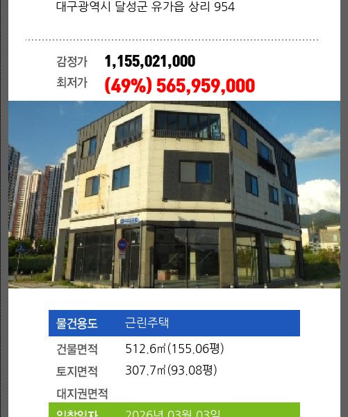 | 소재지 | [지번] 대구광역시 달성군 다사읍 죽곡리 124 주건축물제1동외 3필지 [도로명 주소] 대구광역시 달성군 다사읍 달구벌대로174길 26 주건축물제1동외 3필지 |
