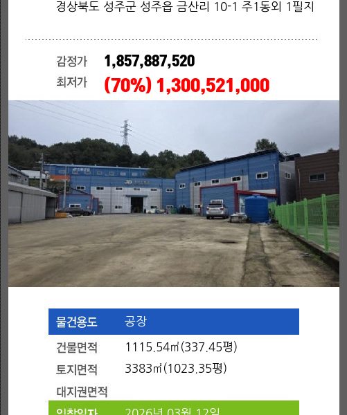 | 건물면적 | 1257.18㎡ (380.3평) | 채무자 | 기** | 최저가 | (100%) 4,503,053,960 |