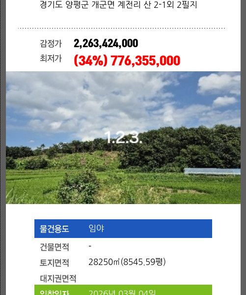 | 토지면적 | 5695㎡ (1722.73평) | 소유자 | 박** | 보증금 | (10%) 98,834,700 |