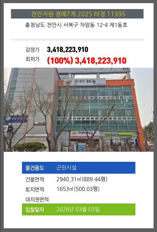 | 용도 | 근린시설 | 채권자 | 농** | 감정가 | 3,418,223,910 |