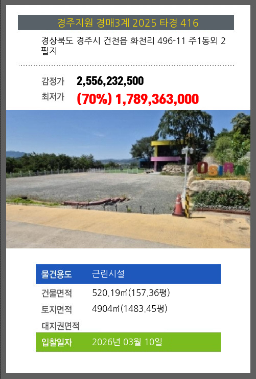 | 소재지 | [지번] 경상북도 경주시 건천읍 화천리 496-11 주1동외 2필지 [도로명 주소] 경상북도 경주시 건천읍 내외로 3046-115 주1동외 2필지 |
