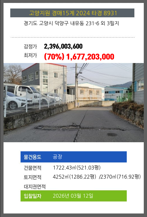 | 토지면적 | 전체:4252㎡ (1286.22평) 매각지분:2370㎡ (716.92평) |