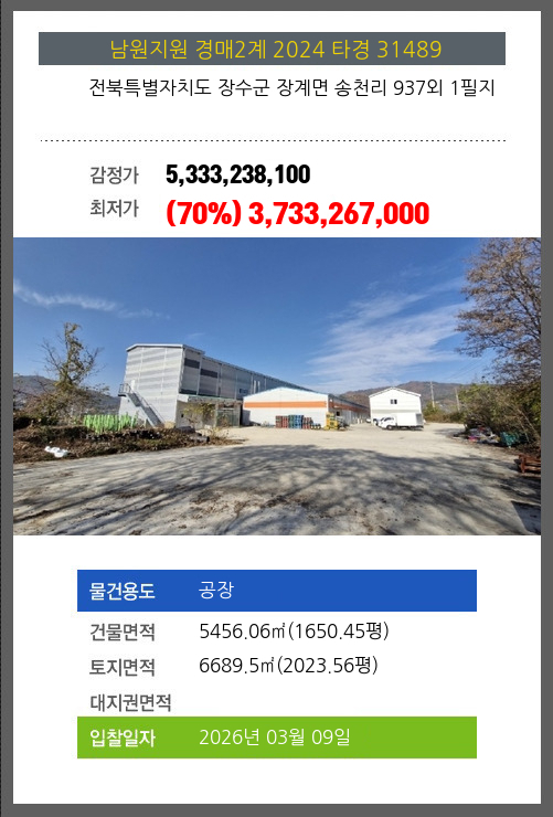 | 용도 | 공장 | 채권자 | 농**외1명 | 감정가 | 5,333,238,100 |
