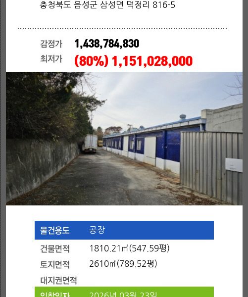 | 소재지 | [지번] 충청북도 음성군 금왕읍 사창리 6-4 제가동호외 10필지 [도로명 주소] 충청북도 음성군 금왕읍 금일로 479-3 제가동호외 10필지 |