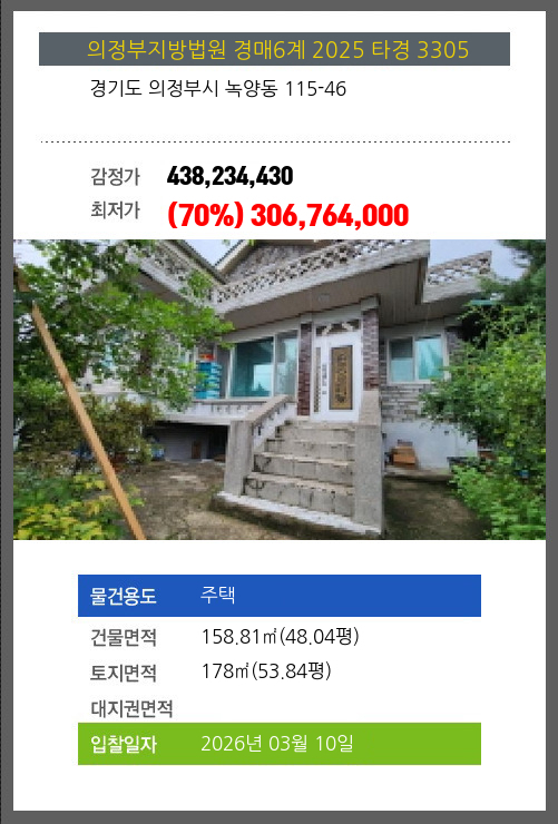 | 토지면적 | 178㎡ (53.84평) | 소유자 | 김**외3명 | 보증금 | (10%) 30,676,400 |