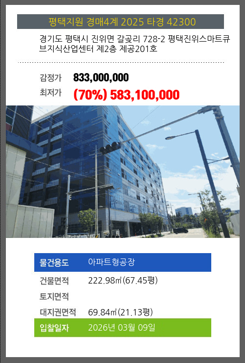 | 용도 | 아파트형공장 | 채권자 | 중** | 감정가 | 833,000,000 |