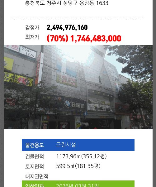 | 건물면적 | 2128.88㎡ (643.98평) | 채무자 | 청** | 최저가 | (100%) 2,234,406,200 |