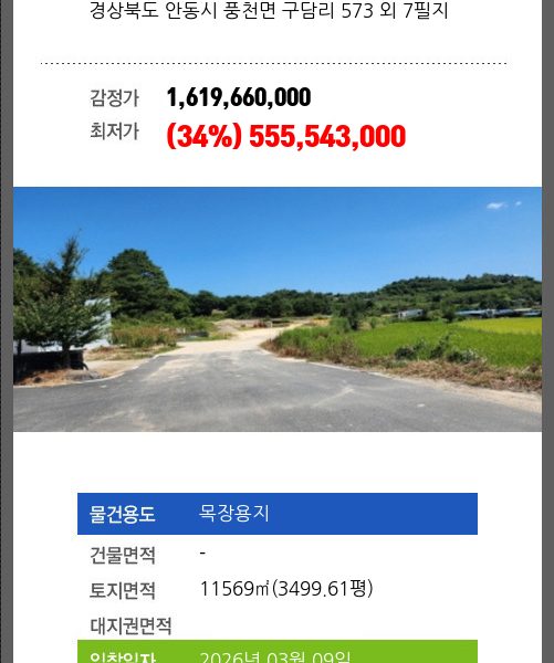 | 토지면적 | 11919㎡ (3605.48평) | 소유자 | 중** | 보증금 | (10%) 50,693,900 |