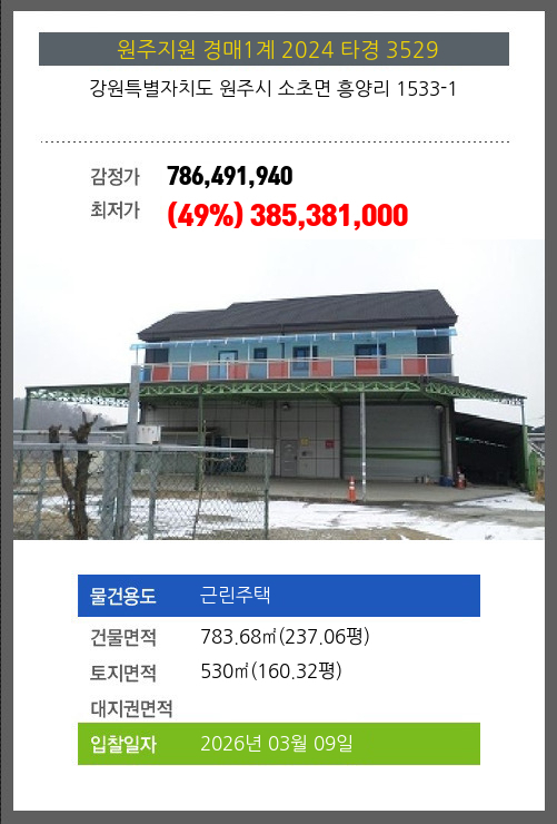 | 건물면적 | 783.68㎡ (237.06평) | 채무자 | 이** | 최저가 | (49%) 385,381,000 |