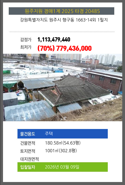 | 소재지 | [지번] 강원특별자치도 원주시 행구동 1663-14외 1필지 [도로명 주소] 강원도 원주시 영랑길 109외 1필지 |