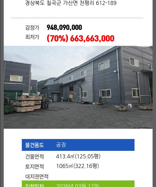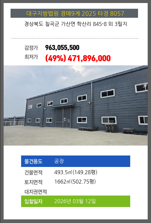 칠곡공장경매 칠곡군 가산면 학산리 845-8 외 3필지 №2025 타경 8057