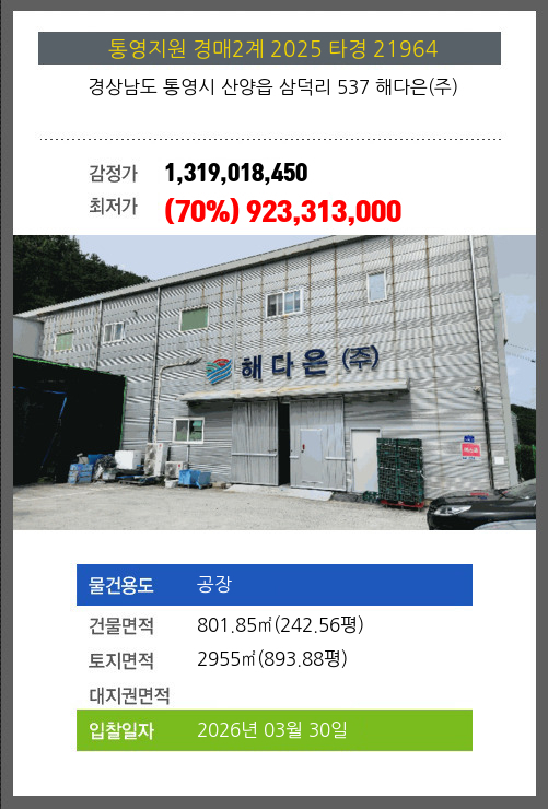통영공장경매 통영시 산양읍 삼덕리 537 해다은주 №2025 타경 21964