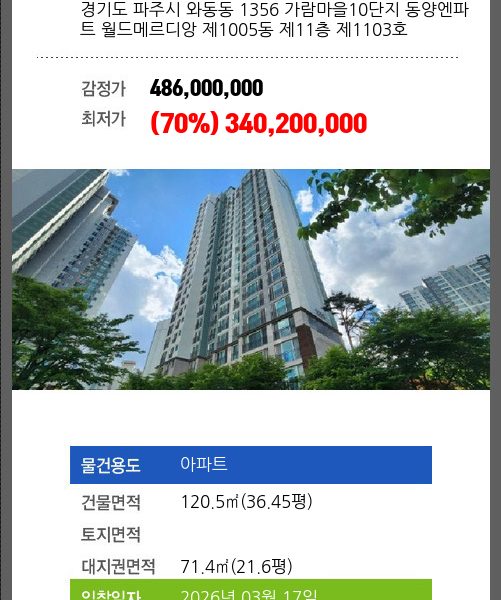 | 용도 | 아파트 | 채권자 | 엠** | 감정가 | 470,000,000 |