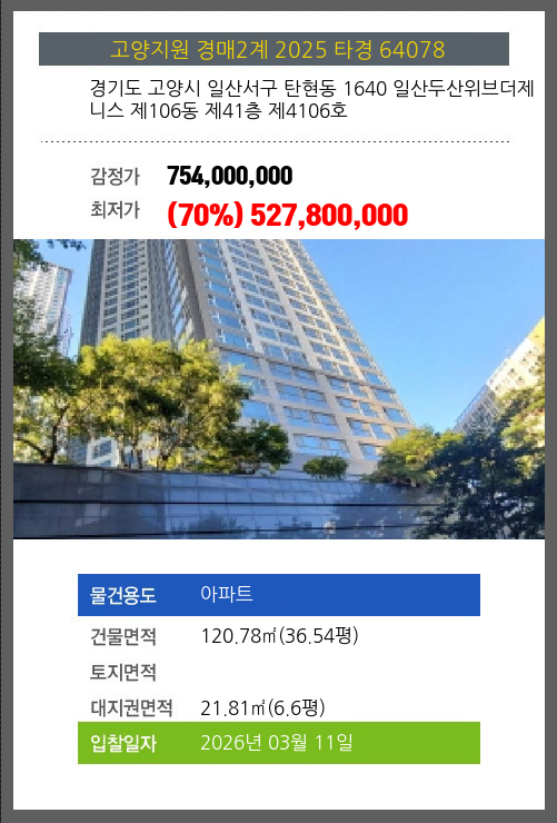 본건은 경기도 고양시 일산서구 탄현동 1640 일산두산위브더제니스 제106동 제41층 제4106호