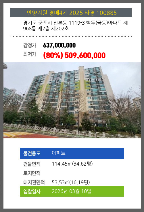 | 소재지 | [지번] 경기도 군포시 산본동 1119-3 백두(극동)아파트 제968동 제2층 제202호 [도로명 주소] 경기도 군포시 고산로539번길 6 백두(극동)아파트 제968동 제2층 제202호 |