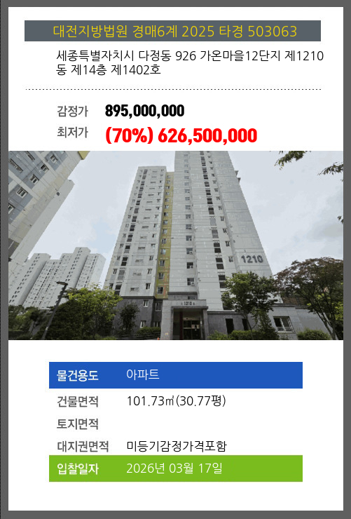 다정아파트경매 다정동 926 가온마을12단지 제1210동 제14층 제1402호 №2025 타경 503063