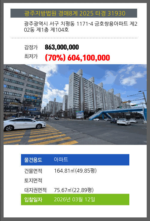 | 용도 | 아파트 | 채권자 | 광** | 감정가 | 863,000,000 |