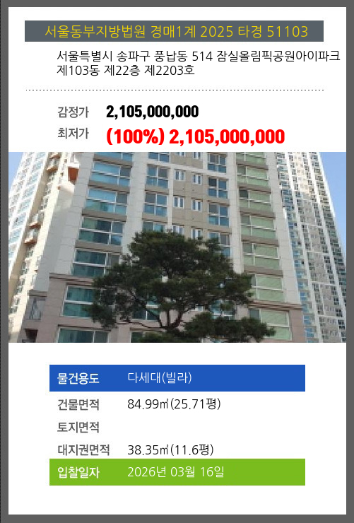 본건은 서울특별시 송파구 풍납동 514 잠실올림픽공원아이파크 제103동 제22층 제2203호