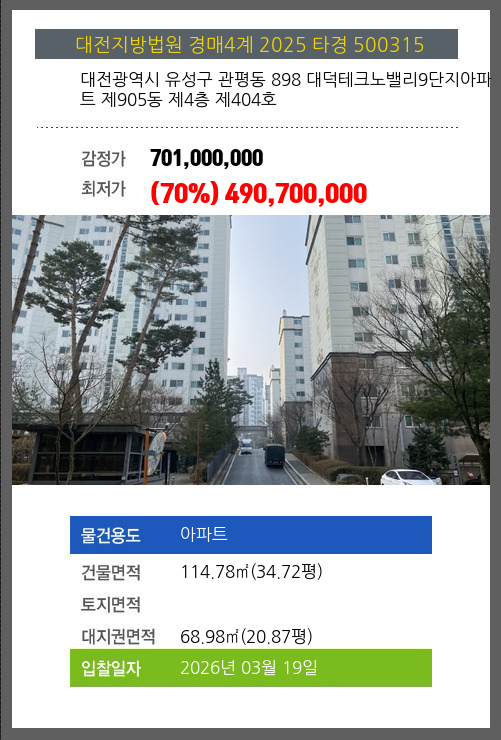 본건은 대전광역시 유성구 관평동 898 대덕테크노밸리9단지아파트 제905동 제4층 제404호