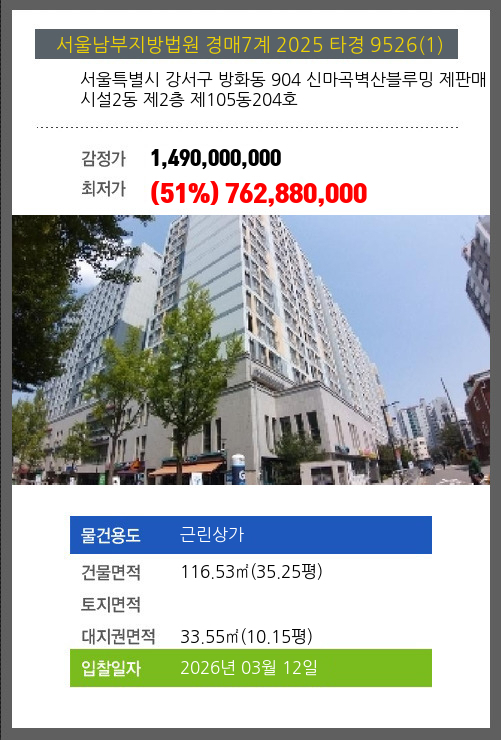 강서상가경매 강서구 방화동 904 신마곡벽산블루밍 제판매시설2동 제2층 제105동204호 №2025 타경 9526(1)