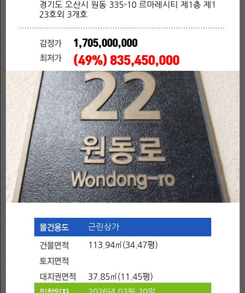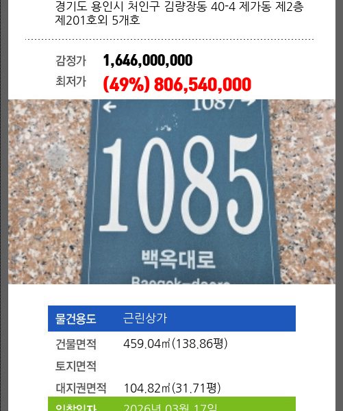 | 용도 | 근린상가 | 채권자 | 문** | 감정가 | 4,180,000,000 |