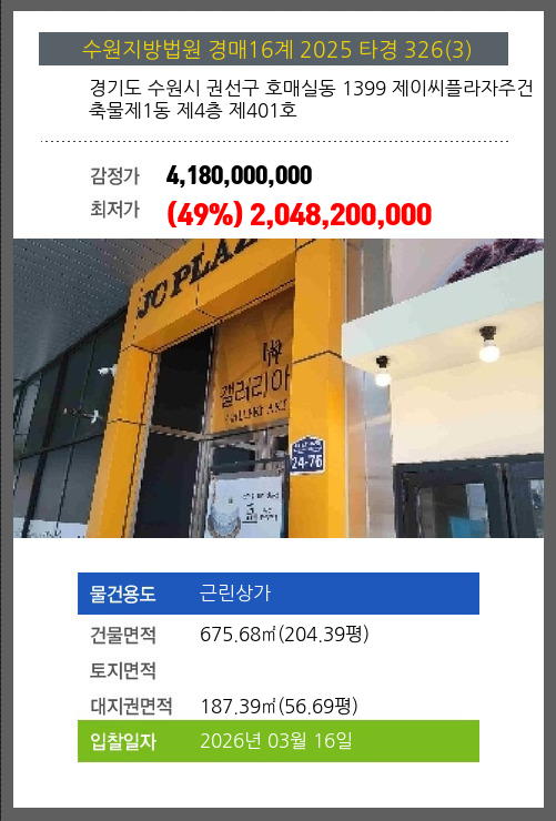 본건은 경기도 수원시 권선구 호매실동 1399 제이씨플라자주건축물제1동 제4층 제401호