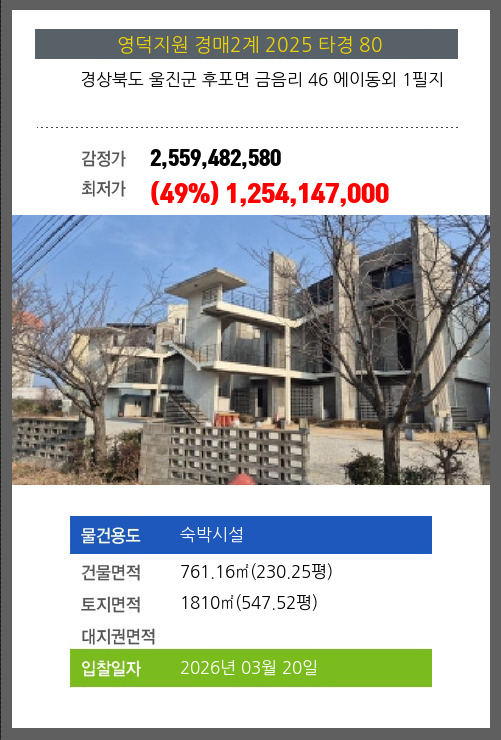 | 소재지 | [지번] 경상북도 울진군 후포면 금음리 46 에이동외 1필지 [도로명 주소] 경상북도 울진군 후포면 동해대로 336 에이동외 1필지 |