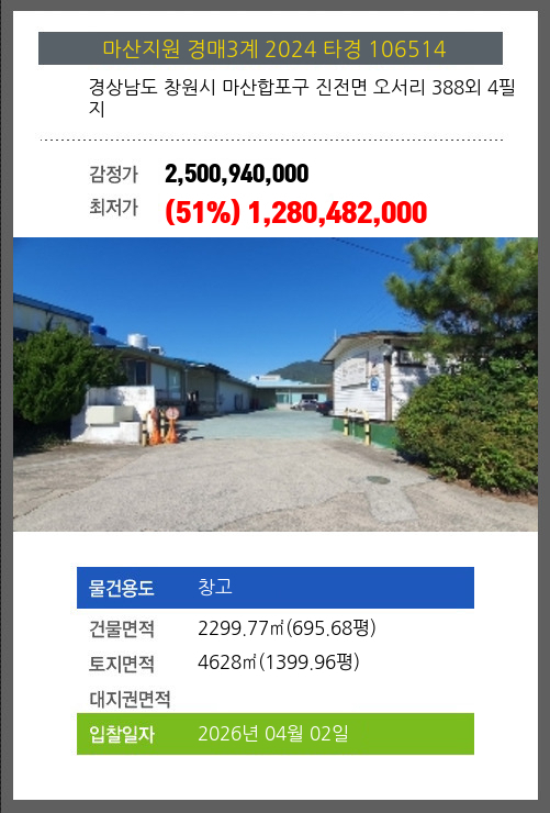 창원창고경매 창원시 마산합포구 진전면 오서리 388외 4필지 №2024 타경 106514