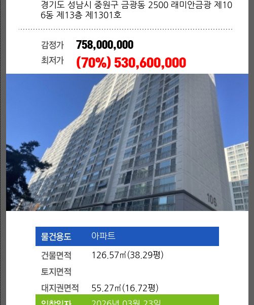 | 용도 | 주택 | 채권자 | 중** | 감정가 | 1,328,188,400 |