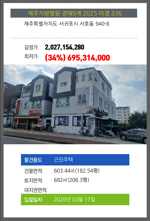 | 건물면적 | 603.44㎡ (182.54평) | 채무자 | 김** | 최저가 | (34%) 695,314,000 |