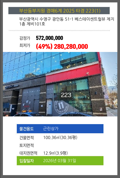 본건은 부산광역시 수영구 광안동 51-1 베스테이센트럴뷰 제지1층 제비101호