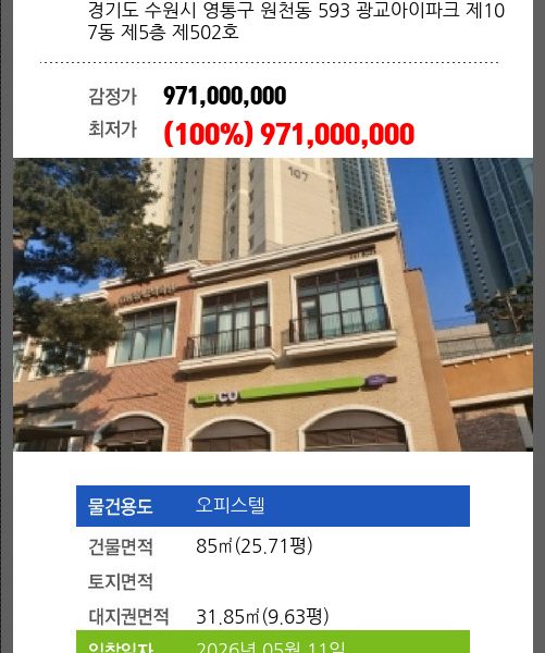| 건물면적 | 102㎡ (30.85평) | 채무자 | ㈜** | 최저가 | (70%) 574,000,000 |