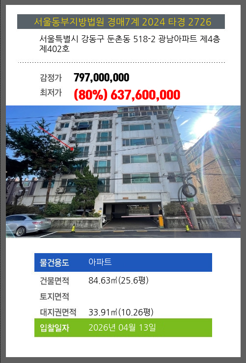 건물면적 84.63㎡ (25.6평) 채무자 어** 최저가 (80%) 637,600,000