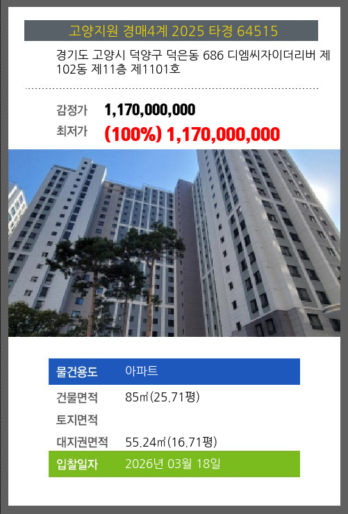 본건은 경기도 고양시 덕양구 덕은동 686 디엠씨자이더리버 제102동 제11층 제1101호