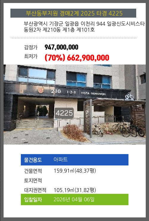 본건은 부산광역시 기장군 일광읍 이천리 944 일광신도시비스타동원2차 제210동 제1층 제101호