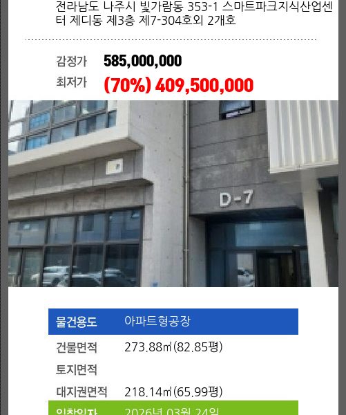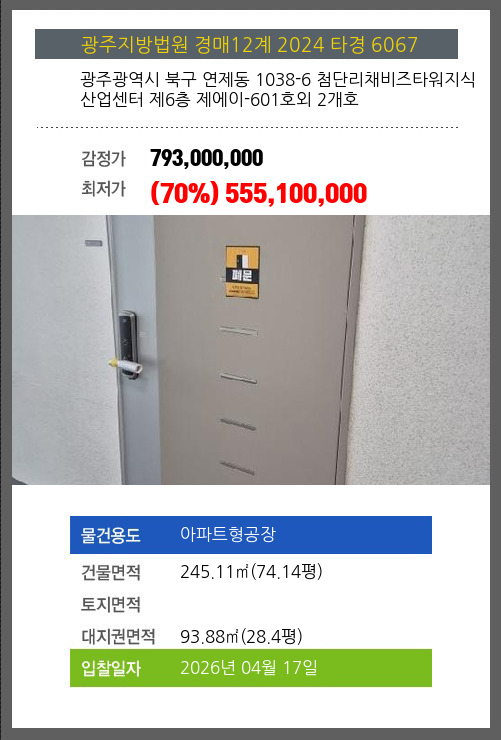 본건은 광주광역시 북구 연제동 1038-6 첨단리채비즈타워지식산업센터 제6층 제에이-601호외 2개호