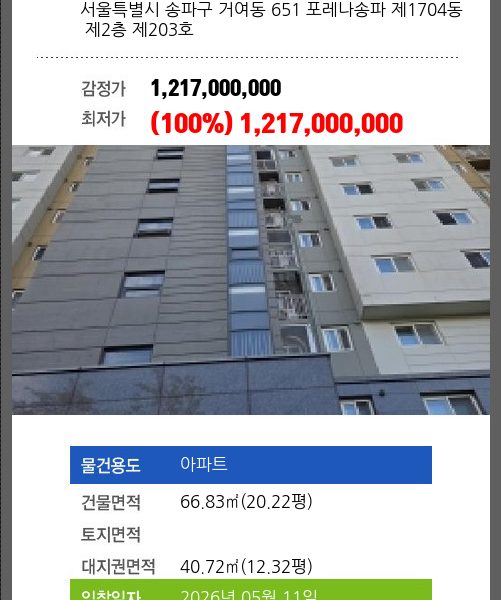 | 용도 | 아파트 | 채권자 | 아** | 감정가 | 1,450,000,000 |