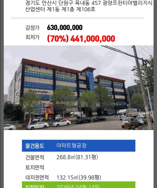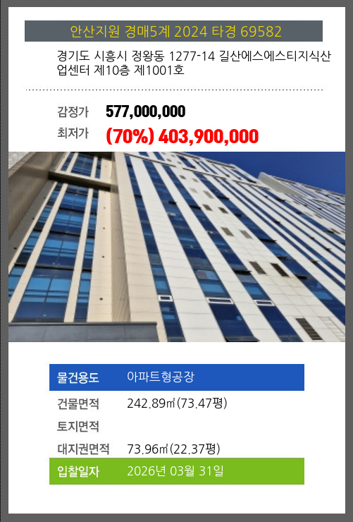 | 용도 | 아파트형공장 | 채권자 | 더** | 감정가 | 577,000,000 |