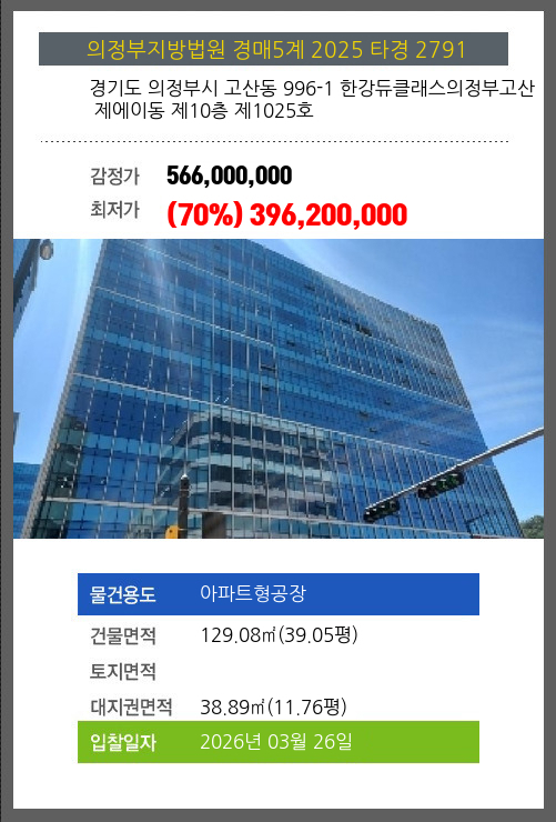 본건은 경기도 의정부시 고산동 996-1 한강듀클래스의정부고산 제에이동 제10층 제1025호