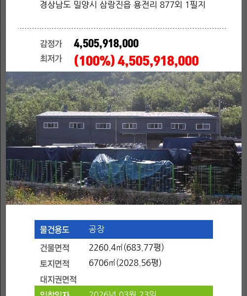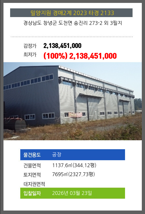 | 용도 | 공장 | 채권자 | 부** | 감정가 | 2,138,451,000 |